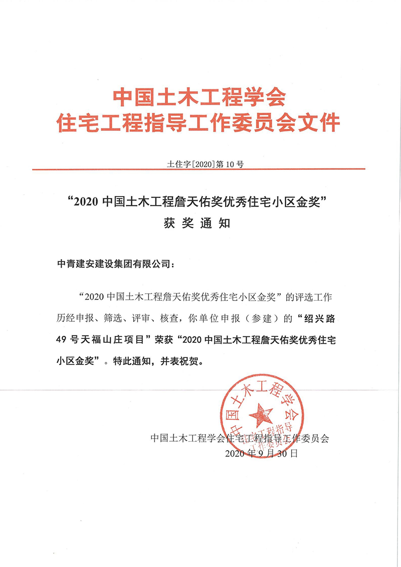 中青建安集团荣获“2020中国土木工程詹天佑奖优秀住宅小区金奖”