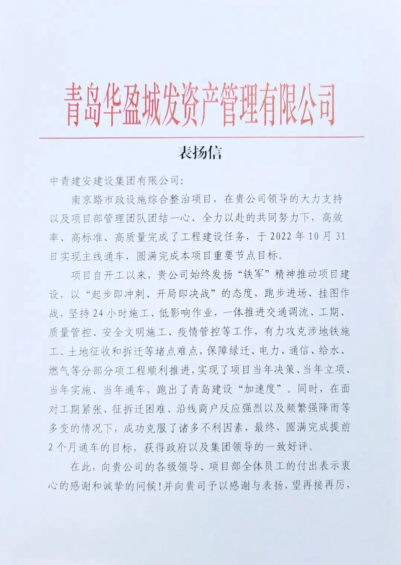 近日,由集团公司承建的南京路市政设施综合整治项目收到建设单位发来的表扬信,信中对项目部高效率、高标准、高质量地完成10月31日主线通车的节点目标给予高度赞扬。 信中提到,该项目开工以来,集团公司项目团队以“...